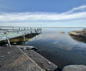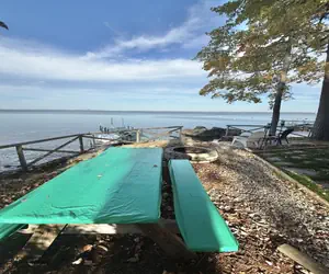 Warm, inviting and comfortable two bedroom log cabin with full bath. Cozy up to the stone fireplace on a chilly night or enjoy the air conditioned living room on those hot summer days. A big enclosed porch with seating and dining areas overlooks the lake, dock, and patio area. Outdoor picnic area for warm weather enjoyment. Walking distance to local convenience store. Nice dock, mooring, and dingy for boat access. Internet and Smart TV.