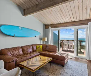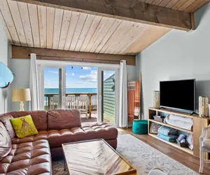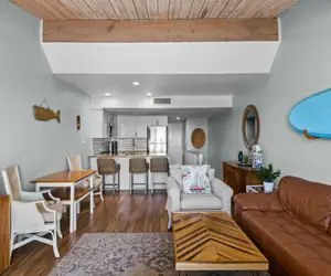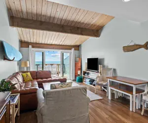 Step into a bright and spacious open-concept living area, where the living room flows seamlessly into the kitchen. The sliding glass doors bring in plenty of natural light and allow you to enjoy glimpses of the ocean throughout the day. The living room offers comfortable seating for gathering, reading, or enjoying movie nights after a day at the beach.