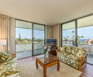 Penthouse Style Living, Spacious 1030 sq ft condo located in White Sands Village Kona's Premier Vacation Rental destination. Private, peaceful corner unit with 416 sq ft wrap around Lanai, top floor with 2 bedrooms & 2 bath nicely appointed, sleeps 6. Master has a California King / hand carved bed set. Guest room has a King bed, living room has a Queen size sofa sleeper. Four floor to ceiling oversized sliding glass doors that offer GORGEOUS OCEAN VIEWS FROM THIS UNIT, with beautiful evening sunsets. BEST of the BEST located in the Kuakini tower. White Sands beach, Magics Beach Grill & Lounge also a Snack Shack are directly across the street.