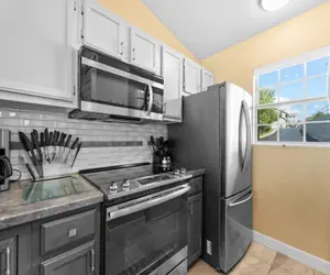 The living room is the ideal place to kick back and relax, with a large plush sofa and a flat-screen TV. The kitchen is fully equipped and has all the essentials you need to prepare and enjoy delicious meals during your stay.