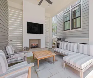 The outdoor space of this Watercolor vacation rental home can be enjoyed year round! The private plunge pool (can be heated for $50/day) is perfect for cooling off after a long day at the beach. There is a fireplace with covered seating that can be enjoyed those early fall mornings or late evenings!