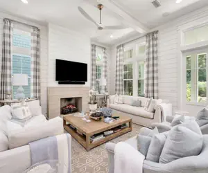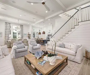 This residence greets you with an inviting front porch that is complete with a swing bed that overlooks the green spaces Watercolor has to offer. The interior of the home welcomes you with 12 foot ceilings and soft, coastal tones found from the living room into the kitchen. The first floor is an open floor plan that allows all to feel comfortable and connected with plenty of space. The kitchen offers stainless steel appliances including a Sub Zero refrigerator and Wolf range. The stylish dining table provides seating for 8 guests and bar stool seating at the center island for 4 guests. The first guest bedroom on this floor has a king size bed and a private bathroom. The next bedroom offers two full size beds and a private bathroom. There is a laundry room and half bathroom on this floor.