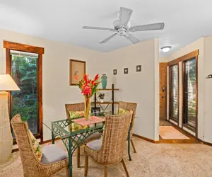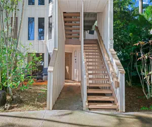Prepare your favorite meals in the well equipped kitchen, complete with modern appliances and all the culinary essentials you need. Enjoy your island fare from the nearby Wednesday farmers market at the inside dining area or enjoy your favorite beverage outside on the private, stream side lanai surrounded by the lush greenery and tropical ambiance.