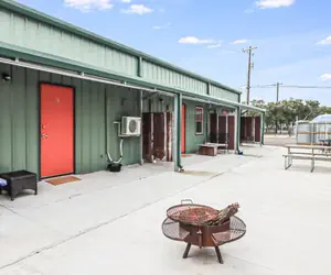 The interior cabin construction was distinctly built using reclaimed materials, as well as the outside patio and parking areas. Outdoor seating and a picnic area are available for a memorable night of conversing by the campfire as the stars come out. The 400 square-foot cabins each boast comfortable beds, soft linens, and a kitchen with a full-size refrigerator, stovetop oven range, microwave, and coffee maker. A floating island breakfast bar is a convenient place to relax and share a meal together. Indulge in a favorite movie on the TV provided.