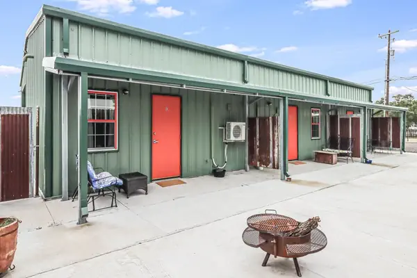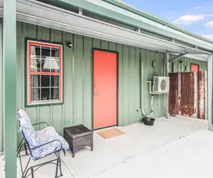 The Casas Coastal Experience cabins are uniquely designed in a South Texas rustic style with a Gulf Coast charm. Located within walking distance of Estes Cove, sunny fun awaits on the shores, at the shops and the eateries that surround it. The South Texas coast area is beautifully embellished with art-like windswept Texas Live oak trees where often Great Blue Herons can be found nesting. On this property, the cedar post fencing, along with reclaimed corrugated tin, and salvaged oil field pipe, represents the area.