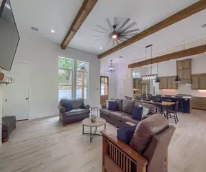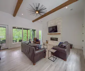 This spacious 4-bedroom, 4-bathroom home comfortably sleeps up to 18 guests and offers two large covered decks overlooking the river, a lower-level entertainment and bunk area, and everything you need for the perfect Hill Country escape.