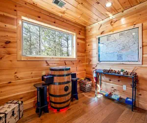 The true highlight of Bobcat Den is the expansive deck, where relaxation and excitement collide. Dive into the private hot tub for a rejuvenating soak, challenge your friends to a spirited game of corn hole, or simply unwind in rocking chairs while taking in the breathtaking mountain vistas. Inside, enjoy endless fun with an arcade game and all your favorite shows on cable TV with Roku.