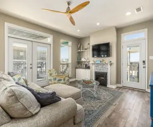 Inside, the open concept living space creates a welcoming place to gather after a day at the beach. Natural light fills the living room where comfortable seating surrounds the fireplace and large TV, making it an ideal spot for movie nights, conversation, or cozy evenings during cooler months. The fully equipped kitchen offers plenty of space for preparing meals together, while the nearby dining area makes family dinners easy and memorable.
