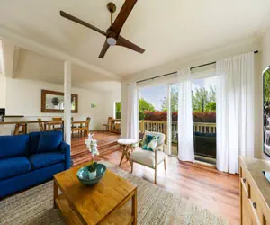 Spacious Living: The open-concept living area is perfect for relaxation and socializing. Unwind on the private lanai and enjoy the island breezes and tropical grounds.