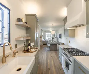 The sunny, fully-equipped kitchen is rich with style with the large apron-front sink in the center of it all. Brushed gold fixtures adorn the gray cabinetry and paneled refrigerator. French doors open to the back deck when you want to step outside or let in a cool ocean breeze.