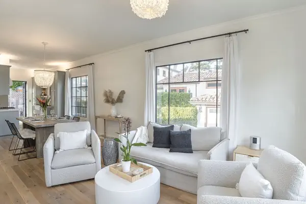 The living room and front porch feature an Ocean view. Soothing neutral hues and wood floors throughout the home set a tranquil tone.