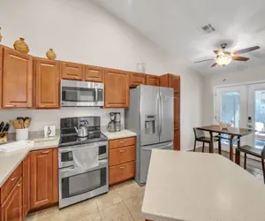 MASTER BEDROOM: King bed, 2ND BEDROOM: Queen bed OUTDOOR LIVING: 1 private patio w/ furniture & gas grill KITCHEN: Fully equipped, coffee maker, microwave, full-sized refrigerator, stove, dishwasher GENERAL: WiFi, washer/dryer, complimentary toiletries, PARKING: Private driveway with garage (1 vehicle), additional guest parking