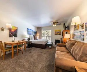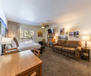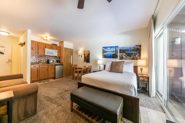 This unit features a complete bathroom and a beautiful balcony overlooking the front lawn and Donner Pass Rd. It is conveniently located a few steps away from the entry stairs.