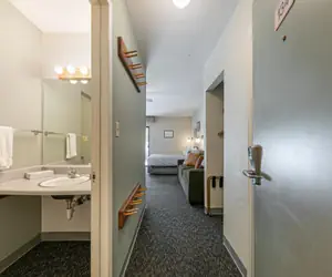 The living area is equipped with a flat-screen TV and cable service, providing entertainment after a day of outdoor adventures. Stay connected with free Wi-Fi, perfect for uploading photos or planning your next day's activities. Relax in a well-appointed bathroom that includes essential amenities such as towels and toiletries.