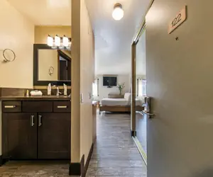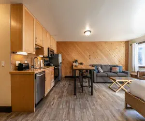 Unit 122 is located on the 1st floor. It includes a Queen Bed and Sleeper sofa, a 52” flat-screen TV, a kitchen with a 4-top stovetop and oven, a sink, a full-sized refrigerator, a microwave, a mini dishwasher, a table with three chairs, and the necessary items to cook a meal. There is one step up to access the bathroom. It is conveniently located near our laundry facility and the building's entrance.