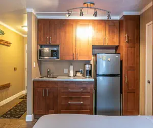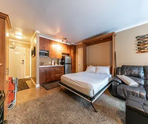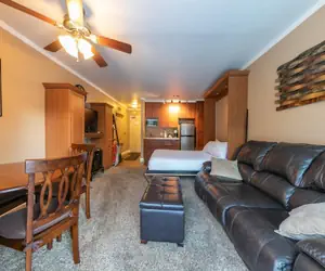 This thoughtfully designed studio features a combined living and sleeping area, complete with a comfortable queen bed and a convenient sleep sofa. The ambiance is warm and inviting, enhanced by an electric fireplace that beckons you to unwind after a day of exploring the outdoors.
