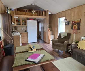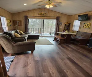 Split Rock Retreat is a Beautiful small family owned campground with 3 cabins, a host cabin and 2 RV sites. Cabin 9 is the Sunflower Cabin and is one of two cabins, but your space is private and you get it all to yourself. Each cabin has its own parking, private entrance, kitchen, modern bathroom, a full bedroom, a short loft and hide-a-bed sofa! You also have your own patio with firepit/picnic table and lighted area in the forest setting. Walking distance to the Water Covered Porch Designated Picnic Table Fire ring all to yourself.