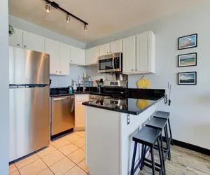 The living and dining area opens into a bright, inviting space where large windows bring in natural light and the sound of the waves fills the air. The full kitchen is equipped with full‑size appliances, cookware and dishes—everything you need to enjoy anything from a casual breakfast to a relaxed dinner at home. With the beach just steps from the door, you’ll feel the sand, sun and surf in close reach.