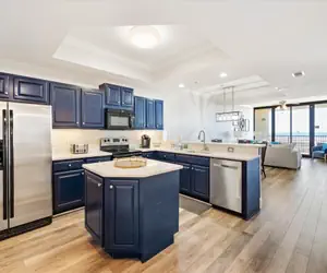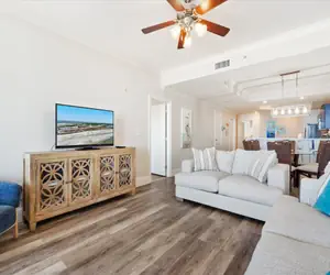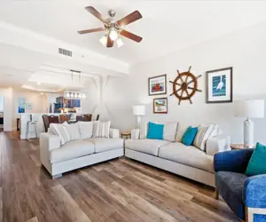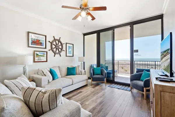 Upon entering, you'll immediately be greeted by the inviting common area, featuring a fully equipped kitchen with a floating island and peninsula. The dining area seamlessly transitions from the kitchen's eating space to a circular dining table, perfect for family meals. The living room boasts a large flat-screen TV and ample seating for guests, with two floor-to-ceiling windows and a sliding glass door providing breathtaking views of the Gulf beyond the balcony. A dedicated laundry room is conveniently located next to the kitchen for added convenience.