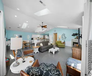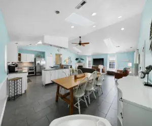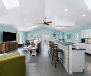 Just For the Shell of it boasts over 3,500 square feet and allows everyone to spread out. Take the elevator or stairs to your over 2,500 square foot living space situated on the second level and provides a large open kitchen adjacent to a 900 square foot great room. The great room has a 70-inch tv and a large open concept. A home that's made for vacationing with full kitchen amenities and an extra fridge on the lower level. Bringing your fur baby? The front porch has a gate for your pets at the top of the stairs and a high-top table to enjoy the outdoors.