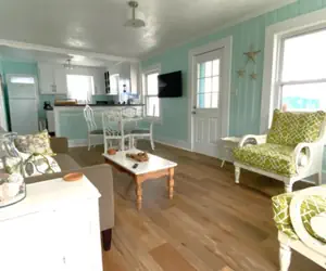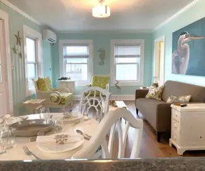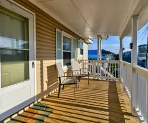 When entering the home through the front door you will walk up one flight of steps onto the gated porch/balcony. The balcony offers a small table with seating for your morning coffee. Opening the keyless front door entrance, you will be welcome with a beautifully updated living room. It offers a smart TV for all watching and streaming needs. The living room leads to a gap space with seating for 4 people. Beyond the seating for 4 is a recently updated kitchen. The kitchen offers a fridge, oven, and microwave. There are both drip and Keurig coffee machines. The bedrooms are separated by a full sized bathroom off the living space. The bedrooms both offer king beds for a comfortable place to rest after a beach filled day. Each bedroom has a small closet to unpack your wardrobe and wall HVAC units to keep you at a comfortable temperature.