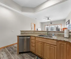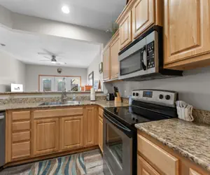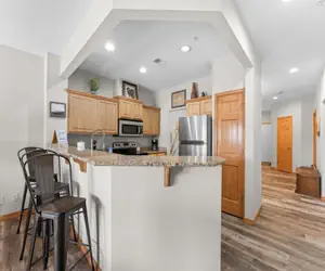 As you step into your cozy yet modern condo, you're greeted by an inviting atmosphere filled with natural light streaming through large windows that frame picturesque views of the lake and surrounding forested hills. The living area beckons with plush furnishings, perfect for unwinding after a day of exploration. Sink into the comfortable sofas as you catch up on your favorite shows on the flat-screen TV, or chat about your daily adventures with your loved ones.