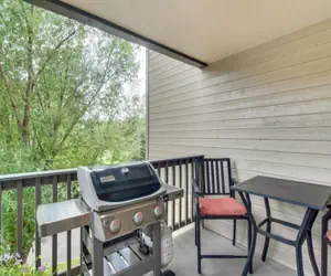 Make your way to the living room and you will enjoy the perfect spot to relax after a day full of outings. The living area is outfitted with a beautiful big screen TV, comfy couch and fireplace. This unit boasts a covered private patio complete with a BBQ and outdoor furniture where you can listen to the babbling creek. There is a wonderful path to walk alongside it as well.