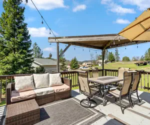 The home features WiFi, four TVs, a DVD player, and central heating and air conditioning. The fully equipped kitchen includes a microwave, dishwasher, coffee maker, toaster, washer, and dryer. Guests can enjoy the large deck and cook on the gas BBQ (propane not included).