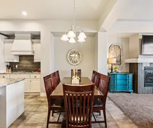 The living spaces are thoughtfully appointed for both relaxation and entertainment. Whip up delicious meals in the fully equipped kitchen, then gather around the dining table for memorable family dinners. The inviting living area beckons you to sink into plush sofas, where you can enjoy movie nights or simply bask in the warmth of the fireplace.