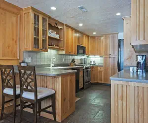 An open floor plan leads from the living room to the dining room/ kitchen area. This large galley style kitchen offers space for gathering while preparing meals together or while sharing a glass of wine. The kitchen offers many luxuries of home and features a fully stocked kitchen and dining area that comfortably seats eight people, with additional seating at the bar.