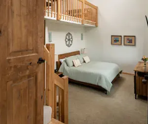 Back through the living room, you’ll find the primary bedroom suite, a serene and spacious retreat with a king-size bed and private loft space above—perfect for reading, journaling, or enjoying a little solitude. The ensuite primary bathroom features a large walk-in closet, soaking tub, and separate shower, offering a spa-like experience in your own mountain haven.