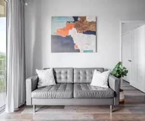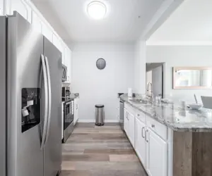 Open plan living area. The kitchen, with Calacatta stone counter-height bar and surfaces, opens into dining area for 6. A cozy seating area leads onto a top floor balcony which is great for breakfast or sunset drinks. With views over the pool and lake, plus seasonal fireworks from SeaWorld just opposite the balcony.