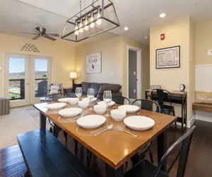 The primary bedroom features a king bed with an attached ensuite, bedroom #2 has a queen bed, and bedroom #3 contains two twin bunks, accommodating a total of 8 guests.