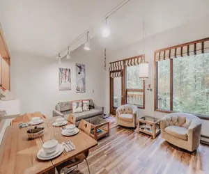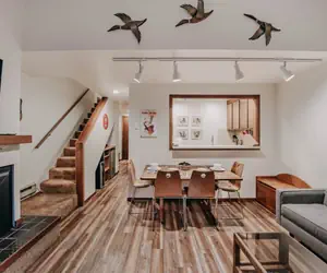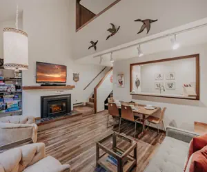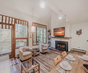 Your family will be delighted while staying in one the most desirable and secluded parts of Snowater! With a river view…yet very close to the community recreational amenities, (and an EV charging station!), this 2-story, 2-bedroom, 2-bath townhouse style condo has it all! Upon stepping inside, you'll discover 1 bedroom on the main floor with 1-full sized bed and 1-set of standard-sized bunk beds…perfect for the kiddos, as well as plenty of closet space. There's also 1-full bath (a rarity among the 2-bedroom condos at Snowater), a fully equipped galley style kitchen including a dishwasher and a pass-through to the living/dining area, plus a small wet bar area tucked under the stairwell in the hallway. A combination living and dining area features a dining table with four chairs (perfect for playing games), a gas fireplace to cozy up to, a flat-screen monitor with Firestick TV, and a balcony where you can sit and relax with your favorite beverage while enjoying the sights and sounds of the river rushing by. Ascending the stairwell to the top floor reveals a loft bedroom with 1-king-sized bed and plenty of closet space, 1-full bath, and a laundry cubby with a stack washer and dryer. Don't forget Fido! This pet-friendly (2-pet maximum, NO exceptions) wifi equipped*and monitored family vacation property will sleep up to 6-persons (ENFORCED Maximum Occupancy!).