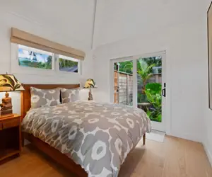 The secondary queen bedroom includes a bathroom with Toto toilet and an adjacent private outdoor shower garden featuring Hawaiian native plants. There is ample storage available in the second bedroom.