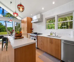 The interior furnishings are a mix of vintage bamboo, midcentury classics, and koa wood Hawaiian furniture. The great room is filled with light, complete with an expansive view of the coconut trees on the property. A large remote-controlled shade allows for complete privacy, day or night, from the glass wall in the living room. The light and ambiance are fantastic throughout the house. It is serene and modern with a big nod to midcentury design, Hawaiian, and Asian art. Beautiful inside and out.