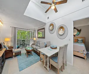 Speaking of the lanai, the sliding glass doors open to a screened-in outdoor space that truly feels like an extension of the living area. Here, you'll find a glass dining table for four, perfect for al fresco dining, and a cozy outdoor couch where you can sip your morning coffee or evening cocktail while taking in the lush landscaping. Surrounded by mangos and palm trees, the lanai offers a peaceful and private retreat.