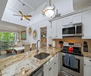 The kitchen is a chef's dream, boasting granite countertops, white cabinetry, and stainless-steel appliances. It's fully stocked with all the essentials you'll need to whip up delicious meals, whether you're preparing a quick breakfast before heading to the beach or a gourmet dinner to enjoy on the lanai.