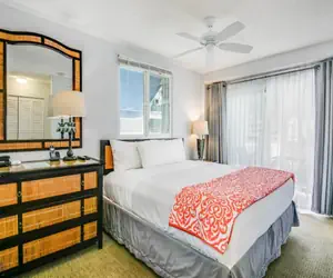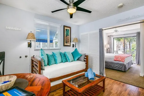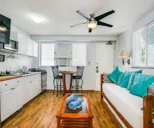 This one-bedroom unit features a private lanai, king size bed (sleeps 2), trundle bed sofa (sleeps 2), full kitchen, and full bath.