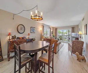 Step into a world of exotic charm as you enter this beautifully decorated two-bedroom, two-bathroom condo. The decor is an eclectic mix of animal prints and earthy hues of brown, beige, and cream, creating a warm and inviting atmosphere. The open floor plan seamlessly connects the dining and living areas, providing a spacious and airy environment for you to enjoy.