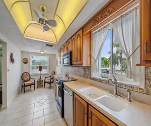 The kitchen is equipped with stainless steel appliances and granite countertops. It comes fully stocked with all the essentials you'll need to prepare delicious meals. A small sitting area within the kitchen offers a cozy spot for morning coffee or a quick snack.