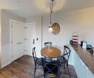 • This one-bedroom condo is the ideal mountain getaway for a small group or couple. Sink into the plush king bed and cozy up by the easy-to-use gas fireplace. The gourmet kitchen is perfect for whipping up delicious meals, while the stylish furniture and art add a touch of elegance to the space. Stay entertained with flat-screen TVs, and soak in the stunning western sunsets from the covered porch.