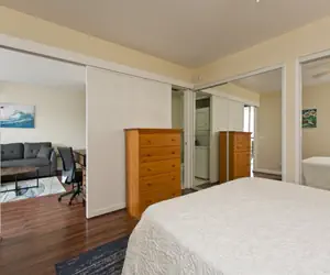 Private bedroom features queen size bed (sleeps 2), ample closet space, dresser, window ac unit, and ceiling fan.