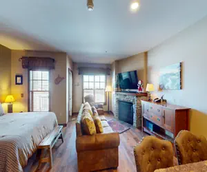 Escape to our classic studio layout and immerse yourself in the cozy ambiance of a mountain lodge. Drift off to sleep on the upgraded king bed, ensuring a restful night before hitting the slopes or trails the next day. Unwind in the comfortable recliner or pull-out sofa by the fireplace, creating the perfect spot to relax after a day of adventure. Step out onto the balcony and soak in the breathtaking sunset views over the western territory.