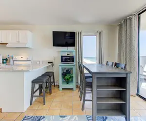 The open living and dining area flows into a fully equipped kitchen with full‑size appliances, cookware and dishes—making it easy to enjoy breakfast together, lunch after a beach walk or a simple dinner at “home” while still being just steps from the shore. Large windows fill the unit with natural light and frame the shimmering coastline, offering an ever‑present reminder of your beach‑front location.