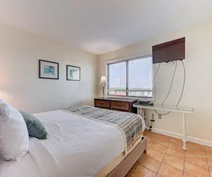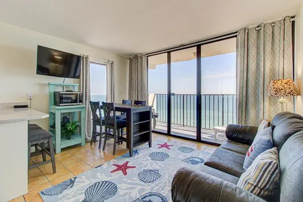 Perched on the 9th floor with sweeping ocean views, this comfortable and stylish oceanfront condo offers a perfect getaway for up to six guests. The master bedroom features a luxurious king‑size bed, designed for peaceful nights as the waves provide your natural soundtrack. Just off the hallway is a built‑in bunk‑bed alcove—ideal for children or extra guests who want a cozy, separate sleep space. The living room includes a sleeper sofa, providing two additional sleeping spots without compromising on comfort or lounging space.