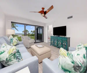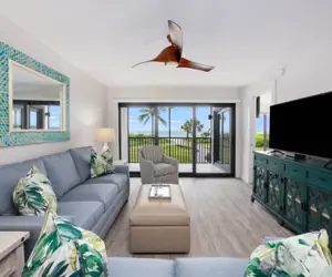 Pelicans Roost is a small complex with only 21 units right on the beach. On three sides, it’s surrounded by palms and tropical vegetation, opening to the sparkling white sand beach and gorgeous Gulf of Mexico. It’s close to shopping, restaurants, the bike path, and tiki bars. Large, heated pool, elevator, and 2 large community gas grills. This is the perfect spot for a Sanibel Island vacation. Oceanfront, White sand beach, Heated pool, 2 large BBQ grills, Elevator, Paved parking, Laundry in unit, large screen TV with Wi-Fi and cable, AC.