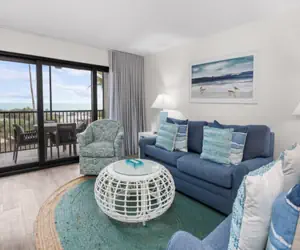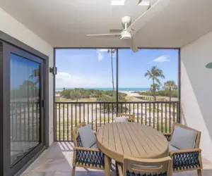 Pelicans Roost is a small complex with only 21 units right on the beach. On three sides, it’s surrounded by palms and tropical vegetation, opening to the sparkling white sand beach and gorgeous Gulf of Mexico. It’s close to shopping, restaurants, the bike path, and tiki bars. Large, heated pool, elevator, and 2 large community gas grills. This is the perfect spot for a Sanibel Island vacation. Oceanfront, White sand beach, Heated pool, 2 large BBQ grills, Elevator, Paved parking, Laundry in unit, large screen TV with Wi-Fi and cable, AC.