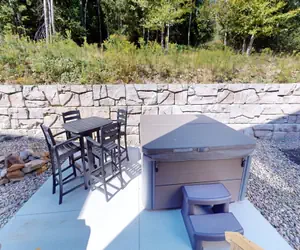 Cook and entertain with ease in the fully equipped kitchen, complete with modern appliances, a large pantry, and a wet bar. After a day on the slopes, gather around the cozy fireplace or relax in the private hot tub under the stars.