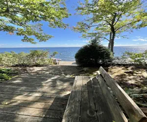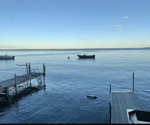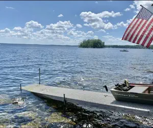 This home is secluded on a serene dirt road, offering ample privacy. A large deck houses a 10' picnic table and umbrella for guests to enjoy outdoor meals. From the picnic deck, a path leads to the waterfront where you can access two docks and a mooring. Please note that due to the strong wave action, it's best to keep boats moored overnight. The waterfront area is rocky, with scattered boulders, providing an ideal location to enjoy the sights and sounds of waves crashing against the rocks.